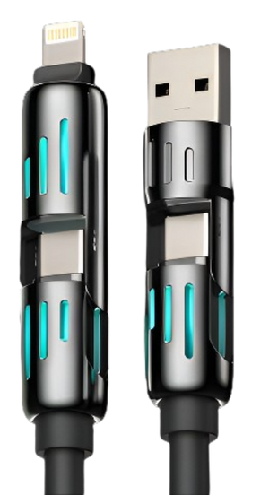 Our 4-in-1 Charging Cable keeps all your devices powered up—fast, clutter-free, and hassle-free. Ditch the drawer full of tangled cords and grab one sleek cable that handles it all—iPhone, Android, tablets, and more. One cable. Total convenience.